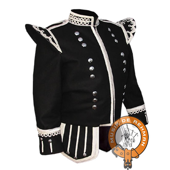 Product Detail :Guards pattern, black melton, 100% wool, fully trimmed with silver braid, double eyes on collar, eyes on cuffs, round thistle buttons.